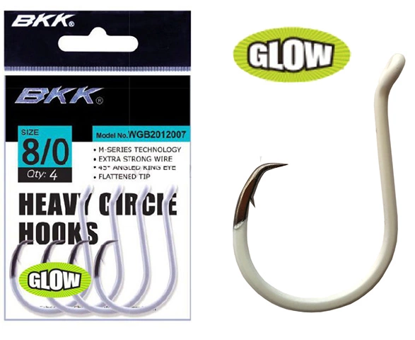 Τα αγκίστρια BKK Heavy Circle Glow σχεδιάστηκαν ειδικά για συνθήκες χαμηλού φωτισμού, δηλαδή για νυχτερινό ψάρεμα ή βαθιά σκοτεινά νερά. H BKK έχει πολύχρονη εμπειρία στην παραγωγή χρωματιστών αγκιστριών. Η πρώτη ύλη εισάγεται από την Ιαπωνία για να μεγιστοποιήσει την λάμψη και την ποιότητα της επικάλυψης.