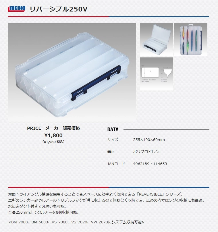 Κασετινάκι διπλής όψεως της επαναστατικής σειράς MEIHO Reversible. Είναι ιδανικό για τη φύλαξη τεχνητών δολωμάτων, τα οποία αποθηκεύονται με τέτοιο τρόπο ώστε να μη χτυπιούνται μεταξύ τους και να μη μπερδεύονται τα αγκίστρια ή οι σαλαγκιές τους. Οι θήκες του έχουν τριγωνικό σχήμα για την πλήρη εκμετάλλευση του χώρου. Μετά τη χρήση μπορεί εύκολα να πλυθεί καθώς διαθέτει αγωγό αποστράγγισης. Μπορεί να προσαρμοστεί στις κασετίνες VW-2070, VS-7070, VS-7055 και BM-5000.